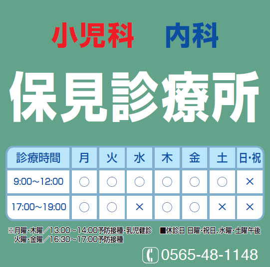 豊田市保見団地内にある小児科・内科医院です。予防接種、乳幼児健診も随時行っております