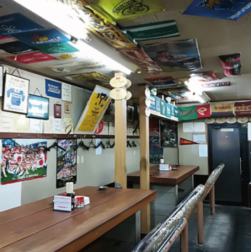 ロッカールームをイメージした店内!壁にも天井にもラグビー選手のサインがぎっしり!
