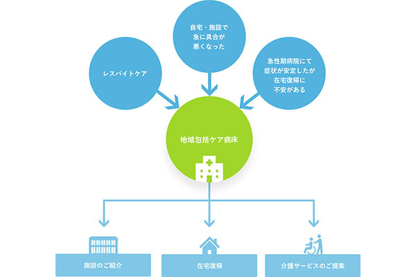 高度急性期医療を引き継いで在宅復帰を可能な状態にまで回復させる機能と、在宅における軽度・中等度の急性疾患に対応して入院受け入れを行い、在宅医療を支援するという両方の病院機能が整備された慢性期医療を提供する病院です。