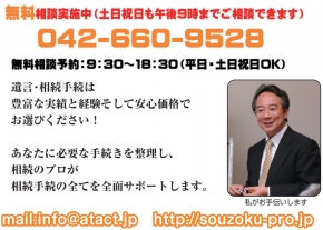 | 備考 | 相続手続きのお悩みは今日で終わりにしましょう。 相続が始まる前の遺言書の作成・生前贈与きから、相続開始後の戸籍の取得や遺産分割、不動産の名義変更、預貯金の解約まで全てワンストップで完了できる事務所です。 完全予約制です。安心してご相談できます。 お客様の話をしっかりお聞きする事から始めます。 [業務内容] 1 相続がはじまる前の対策(生前贈与・未了の相続手続・遺言書・信託) 1)生前贈与 2)未了の相続手続(未登記不動産対策) 3)遺言書 ・家族信託・遺言信託の作成 2 相続開始後の手続(遺産分割・名義変更・不動産売却分配支援・放棄) 1)遺言書の検認 2) 音信不通・連絡が取りづらい相続人対策 3)戸籍による相続人の調査・相続関係図の作成。 4) 遺産分割協議 5) 相続財産の分割 6) 不動産の名義変更・預貯金の解約手続き 7) 相続放棄 8) 遺留分対策 3 任意後見(自分のための相続対策) 1) 認知症と任意後見 2) 尊厳死宣言公正証書 |
