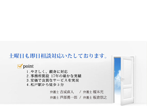 | 備考 | 【土曜日も即日相談対応いたしております。】 ■point 1, やさしく、新見に対応 2, 事務所開設 17年の確かな実績 3, 安価で良質なサービスを実現 4, 松戸駅から徒歩3分<離婚> ○財産分与・慰謝料 ○婚約破棄 ○親権・養育費 <交通事故> ○損害賠償基準 ○交通事故の慰謝料 <債務整理> ○任意整理 ○自己破産 ○個人再生 ○過払い金返還 ○住宅ローン問題 <会社の破産等> <中小企業の法律相談> <相続> ○遺言 ○遺産分割 ○相続放棄 <刑事事件> |