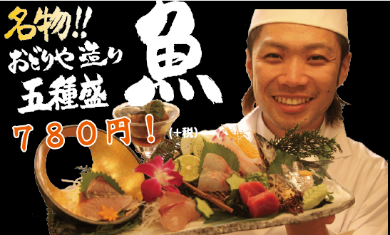 名物!おどりや造り5種盛り780円!毎日一番美味しい食材をご提供、おすすめも日替わり!