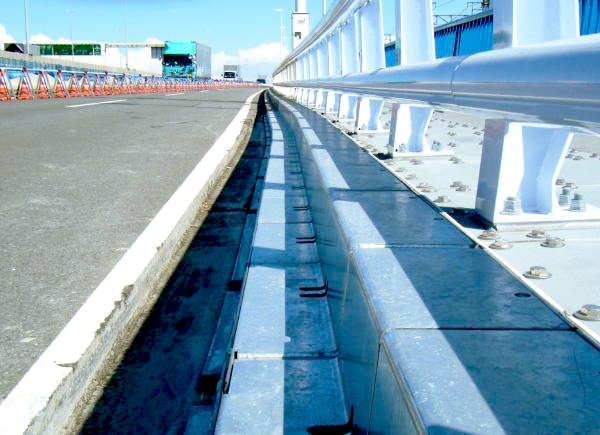 「ブリッジプラス」は、従来のコンクリート壁高欄に比べ、大幅に軽量化を図った鋼製壁高欄です。また、壁高欄部を台座部(床版に固定)から必要な場合に着脱可能としたものが着脱式のブリッジプラスです。着脱は、台座部のレールを利用して行います。切り欠きのある特殊なレール形状により、安全確実に固定でき、しかも事故・災害発生時の緊急車両または作業車両対向車線への移行が必要な場合、壁高欄(中央分離帯)部が着脱でき一部を開放することができます。壁高欄の自重を見直すとともに、作業性の向上、工期の短縮などを一気に解決します。しかも壁高欄の下部は「ガッタースクリーン」とすることにより、機能、美観、そして強度を高い次元で確立することが可能です。