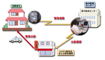 マイコンメータがガスの長時間使用を感知した時、集中監視センターに通報します。