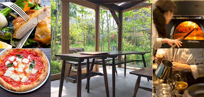 豊かな里山の恵みをシンプルに味わえる、地元産中心の食材をのせた薪窯ナポリピッツァや、素材のうまみと甘味を十分に引き出すオーブン料理、選りすぐりのスペシャルティコーヒーを中心としたドリンク類、デザートなどをお楽しみいただけます。