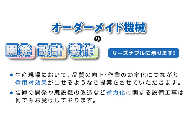 少子化に伴った作業員の確保困難が懸念されます今日、もの創りの品質確保とあわせて解消していけるオーダーメイドの機械設備を設計・製作していき、生産活動のお手伝いができればと考えています。
