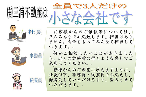 当社は社長、事務員、従業員の3名で営業しておりますが、お客様に少しでも良い不動産情報をお届けしたい、たくさんの物件と接して欲しいという思いで、誠心誠意頑張っております。