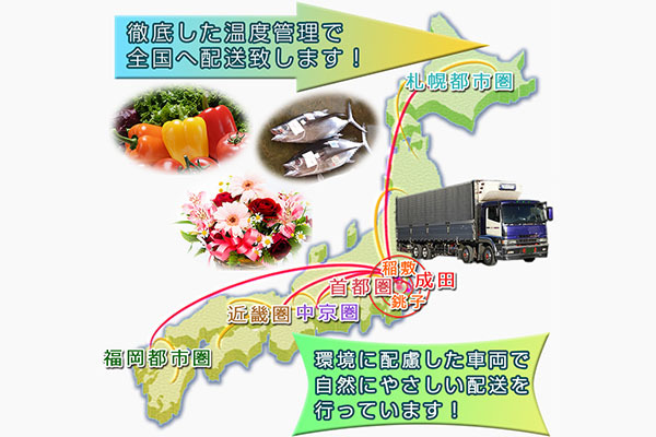 首都圏から近畿や中京、さらに札幌都市圏や福岡都市圏まで全国へ配送しておりますので、配送に関することはお気軽にご相談ください。