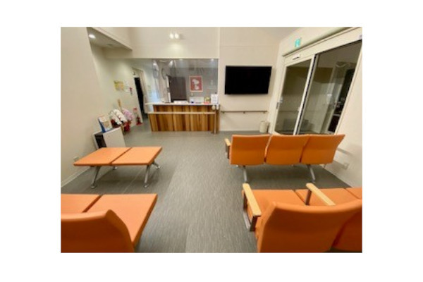 当院の待合室は、患者様にゆったり待っていただけるよう、17席すべてが車椅子でのアクセスが可能なスペースを確保しております。正面には65インチのモニターを設置し、地上波映像に加え、診療の進捗状況や当院からのお知らせなどを表示しております。