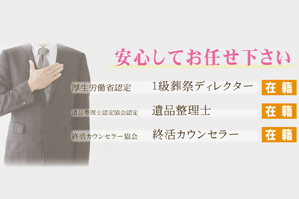 また、弊社には厚生労働省認定の1級葬祭ディレクター、遺品整理士認定協会認定の遺品整理士、終活セラー協会の終活カウンセラーが在籍しております。