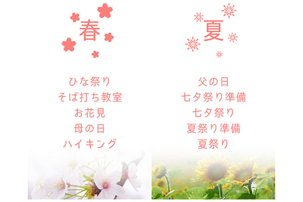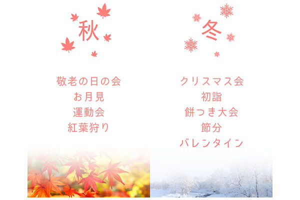 また、季節のイベントや行事も積極的に開催しています。春にはひな祭りやお花見、母の日イベントやハイキングなど、夏には七夕や夏祭り、そして父の日イベントも開催します。秋には敬老の日やお月見、紅葉狩りや運動会、そして冬にはクリスマス会や餅つき大会などを催します。