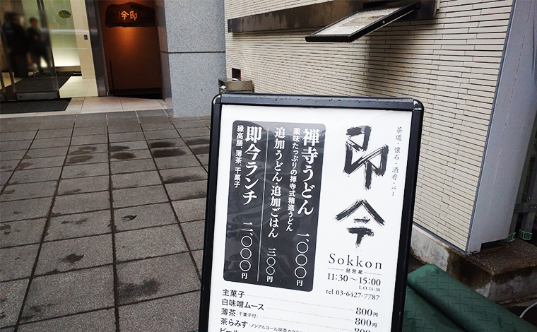 表参道駅のB1出口を出て骨董通りを六本木方面へ5分程歩くと、「即今(そっこん)」さんの看板が見えてきます。インパクトのある看板に書かれた2種類のランチメニュー『禅寺うどん』と『即今ランチ』が目を引きます。落ち着いた佇まいの階段を下った地下にお店があります。(※掲載写真は2019年11月時点での情報です。2019年12月現在、即今ランチには薄茶は付いておりません。)