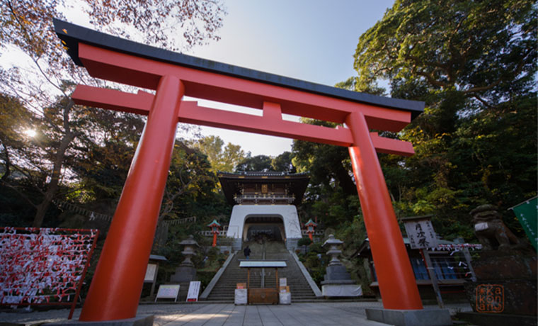 日本三大弁財天を奉る「江島神社」、片瀬江ノ島駅から本殿の辺津宮までは15分ほど歩いたところにあります。主に「辺津宮」「中津宮」「奥津宮」の三社からなる神社で、それぞれ別のご利益がある神様が祀られています。