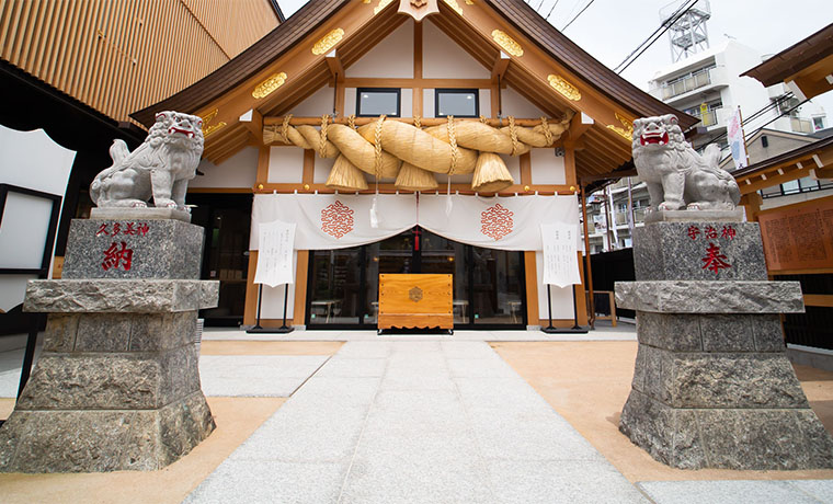 結婚式を挙げる方も多く、七五三・お宮参り・安産祈願など、様々な目的で訪れる方が多い神社です。四季折々の景色の中に、三ノ鳥居をはじめ朱色の建造物が綺麗に映えます。