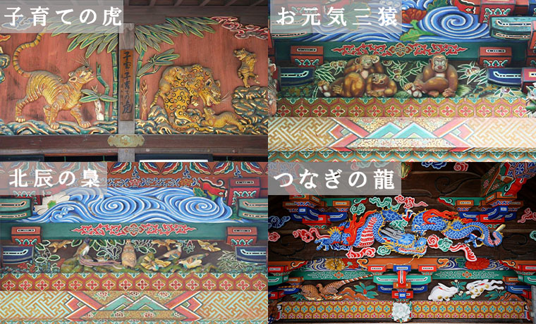 また、秩父神社本殿側面には『子育ての虎・北辰の梟・つなぎの龍・お元気三猿』の4つの動物の彫刻があり、それぞれご利益が異なります。その4つの中から、自分の願いに合った動物を1つ選んで願うと叶うと言われています。
