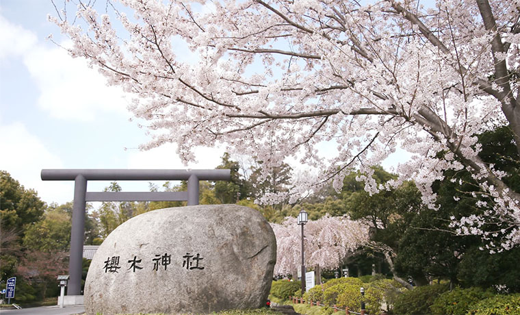 桜の名所としても有名な神社で、お花見の時期には多くの参拝者が訪れます。また、桜をあしらった合格祈願・学業成就のお守りは受験生などに人気です。